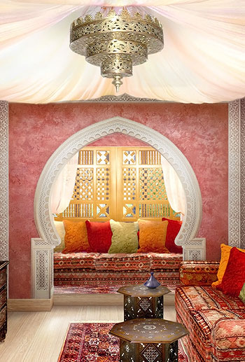 Для восточного стиля характерно мягкое, рассеянное освещение, создающее атмосферу загадочную, интригующую и манящую. Весь принцип создания этого яркого насыщенного стиля основывается на игре с пространством. Здесь умело подбираются восточные люстры и светильники, которые несут не только мистический характер, но также отличаются особой функциональностью. При помощи арабской люстры можно очень изящно скрыть недостатки комнаты, подчеркнув ее достоинства.
