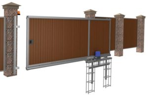 Важно знать: для установки откатных ворот надо, чтобы от их стоек было не менее 5 метров свободного пространства по линии ограждения. Особенности откатных ворот Обычно для изготовления откатных ворот применяют металлический профлист, и эстетичнее, когда такой же профлист применяется для изготовления забора. Ворота устанавливаются на ролики. Лучше всего, когда откатные ворота перемещаются не по нижним или по верхним направляющим, а когда их нет вообще. Установить на такие ворота электрический привод не составит большого труда. При помощи брелока или пульта открывать такие откатные ворота можно будет простым нажатием кнопки.